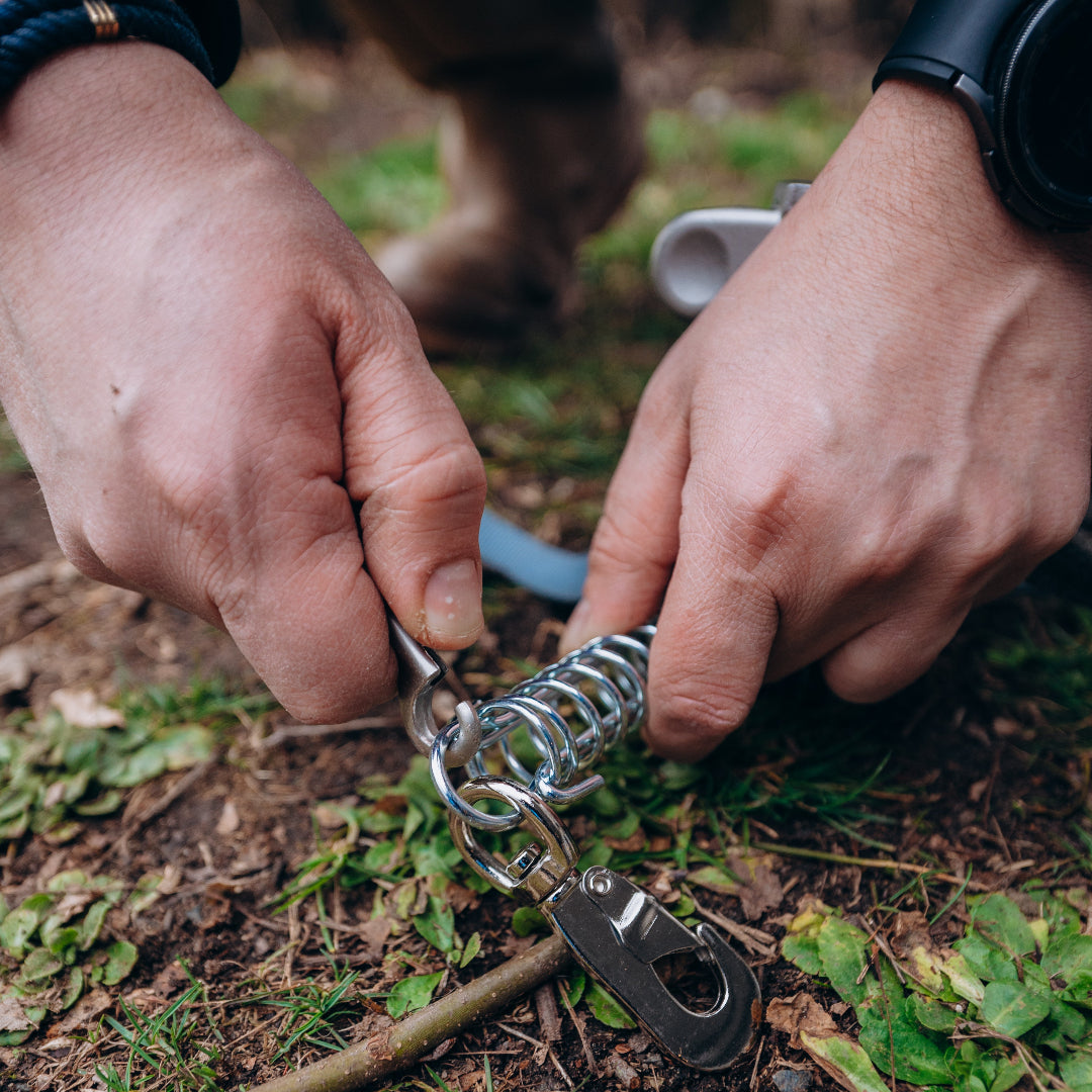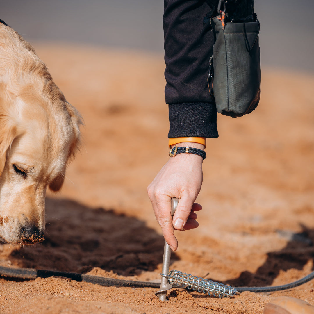 PetPeg 2.0 is made from recycled marine-grade stainless steel. This ground anchor with integrated shock absorber is designed to leash dogs, cats, and other pets safely—usable in most ground types.