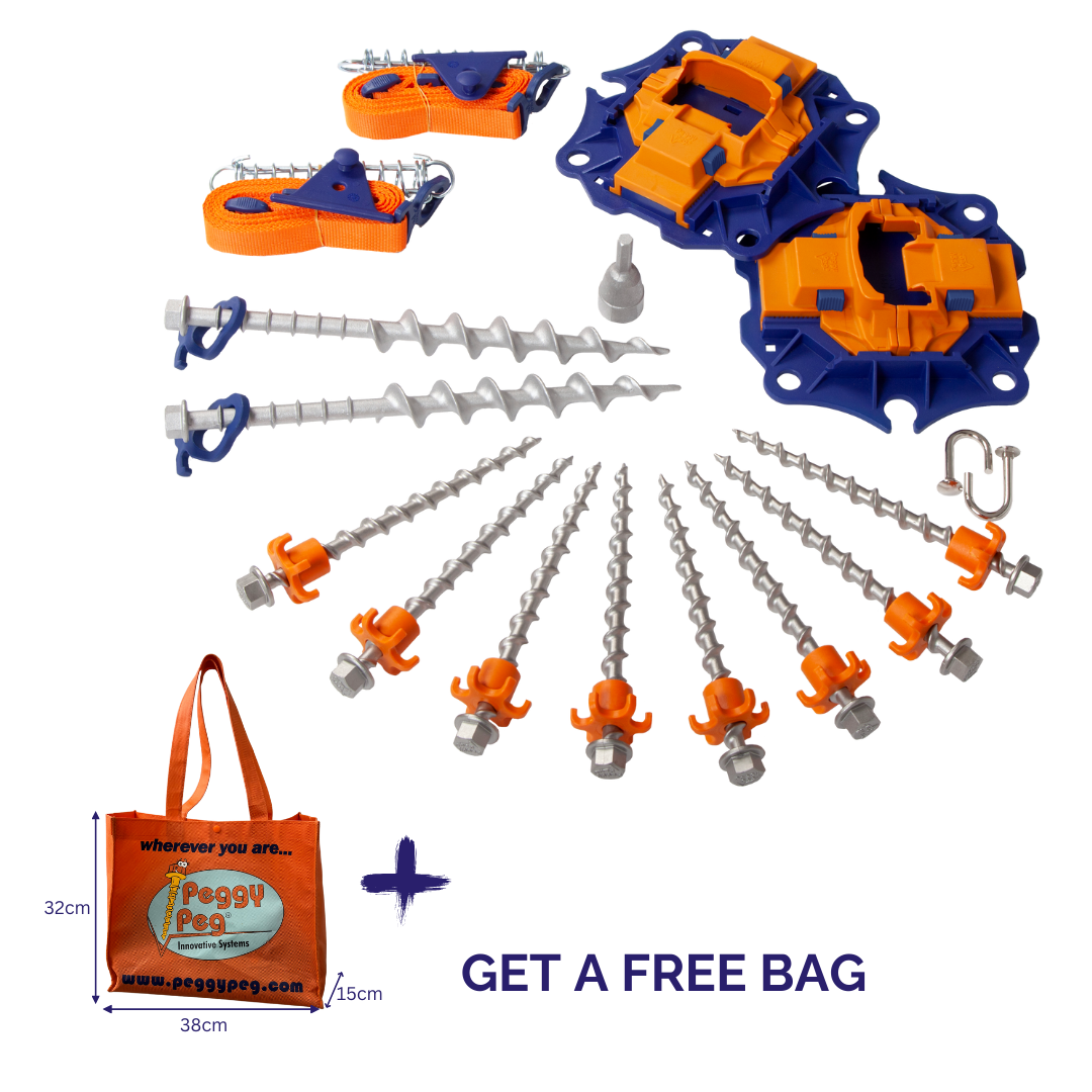 The Stormproof Starter Set is the perfect solution for campers who want to anchor their awnings, tents, or sun sails easily and reliably. This all-in-one kit combines innovative tools and durable components to ensure your setup stays secure, even in challenging conditions.